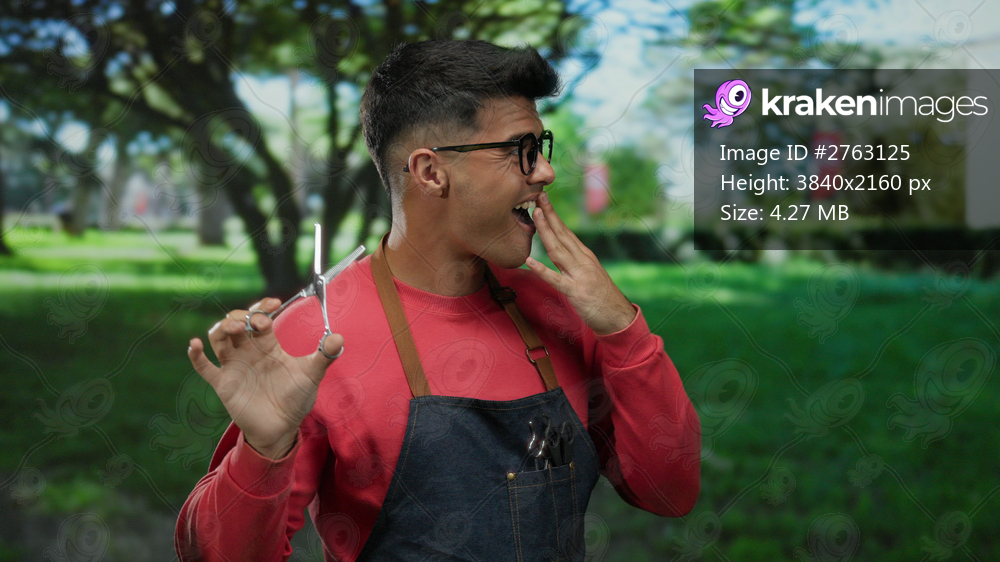 Young man holding scissors in a park setting, expressing playfully with glasses and apron, showcasing a stylish, outdoor, casual vibe with vibrant attire. - Kraken Images