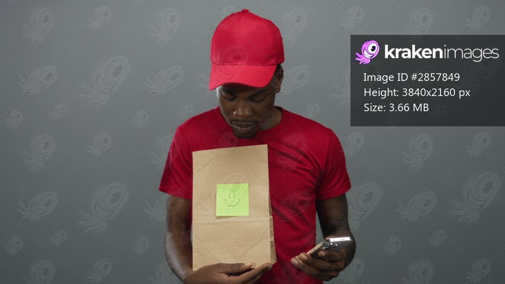 Young man holding smartphone and paper bag with smiley note while looking down in gray studio; curiosity.