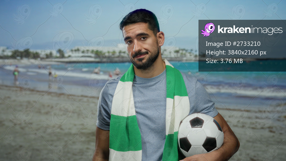 Young man holding soccer ball at seaside, wearing green scarf, enjoying sunny day by the ocean, surrounded by beachgoers, exuding youthful charm and enthusiasm. - Kraken Images