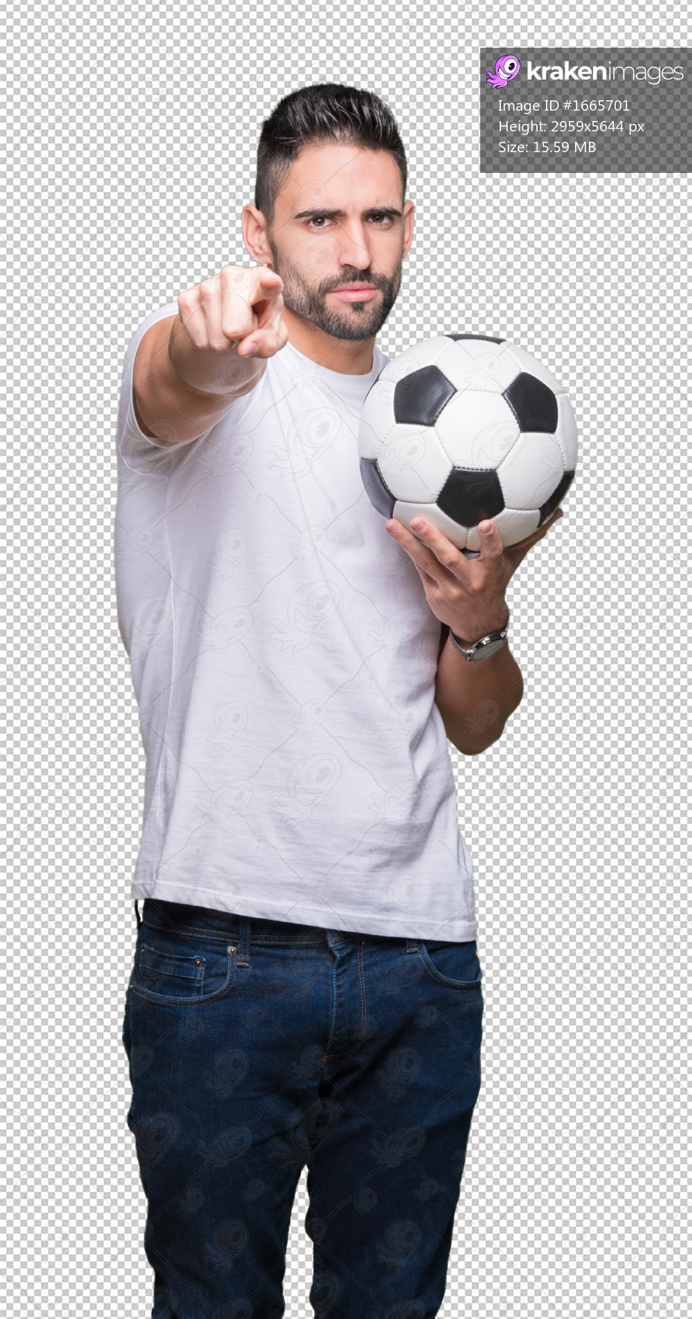 Young man holding soccer football ball over isolated background pointing with finger to the camera and to you, hand sign, positive and confident gesture from the front - Kraken Images