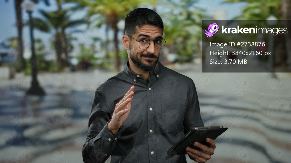 Young man holding tablet outdoors with palm trees and urban street background on sunny day in city setting suggesting modern lifestyle and digital engagement - Kraken Images