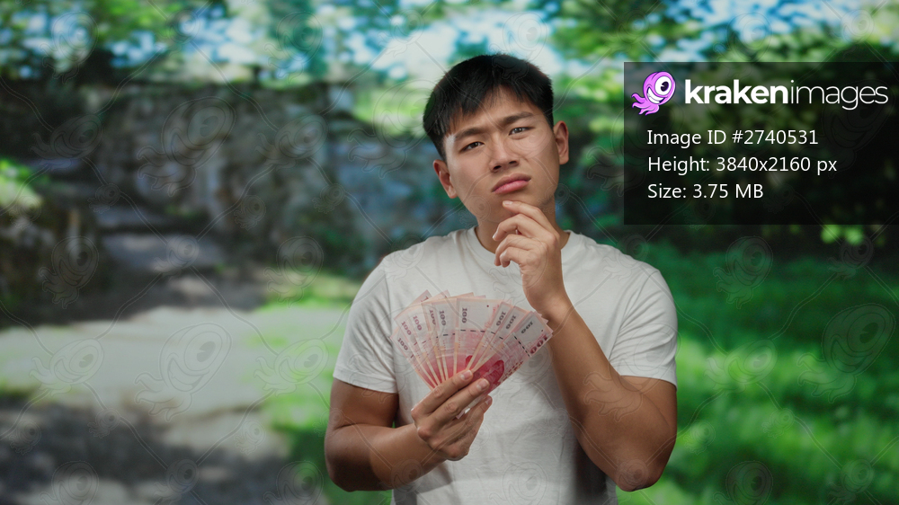 Young man holding taiwanese banknotes thoughtfully in a sunny outdoor park setting highlighting a contemplative expression.