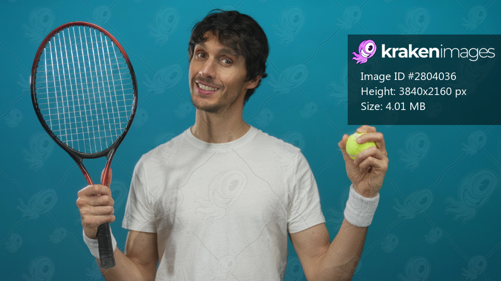 Young man holding tennis racket and ball while smiling in front of bright blue studio wall; confidence.
