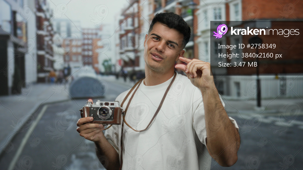 Young man holding vintage camera on city street gestures for a small size with hand while standing outdoors on an urban road with brick buildings.