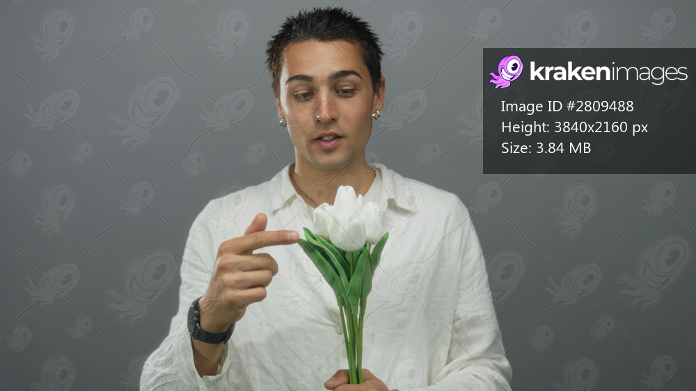 Young man holding white tulips points playfully against a grey isolated wall background.