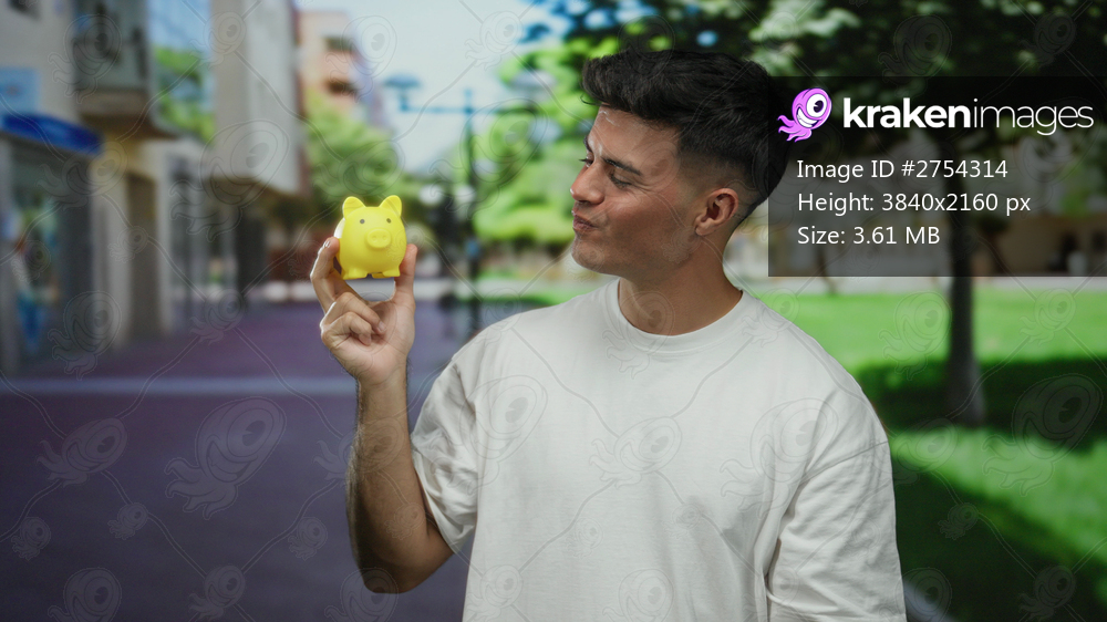 Young man holding yellow piggybank outdoors on a city street indicating personal finance or saving money concept with a thoughtful expression.