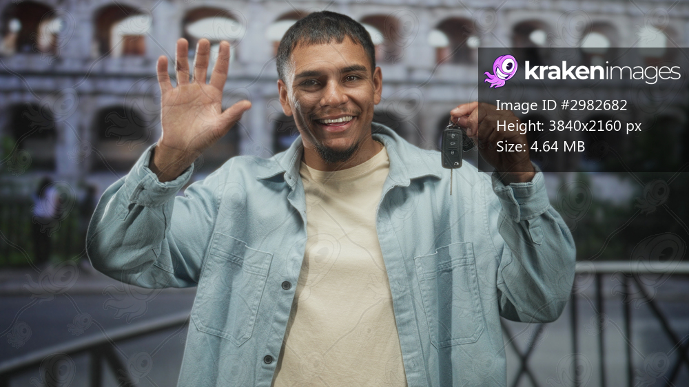 Young man holds car keys, waves hand and smiles while standing before the stone arches of a building colosseum tourist site; travel joy.