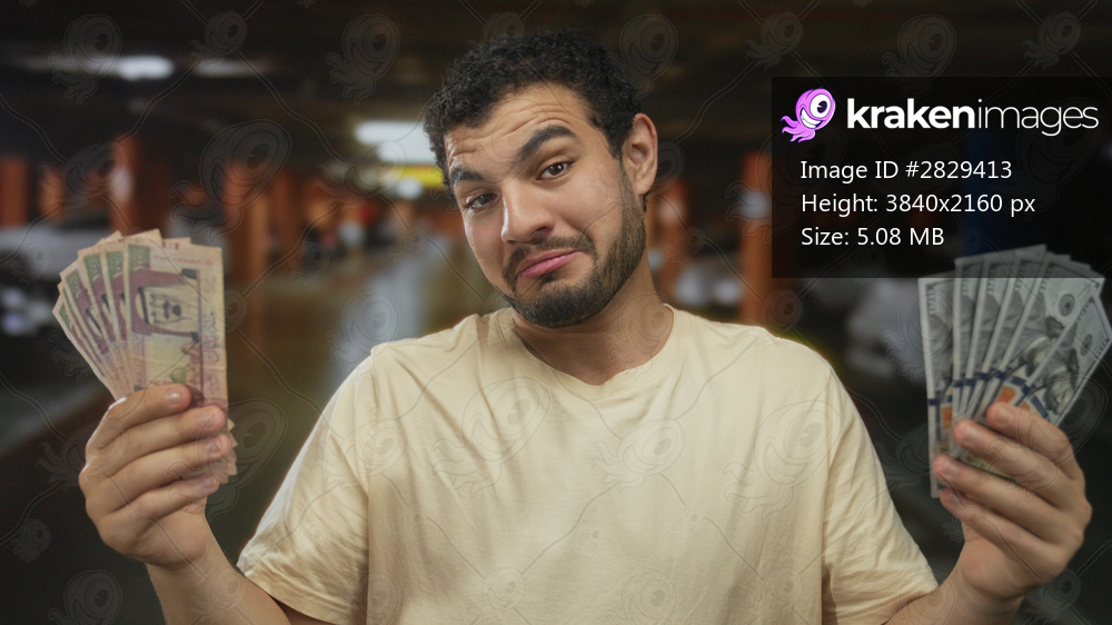 Young man holds cash fanned between hands in a parking building interior while comparing riyal and dollar bills; confidence.