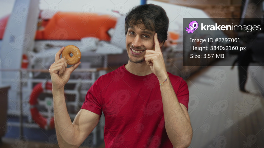Young man holds glazed donut and points finger to head on sunny cruise ship deck; playful curiosity.