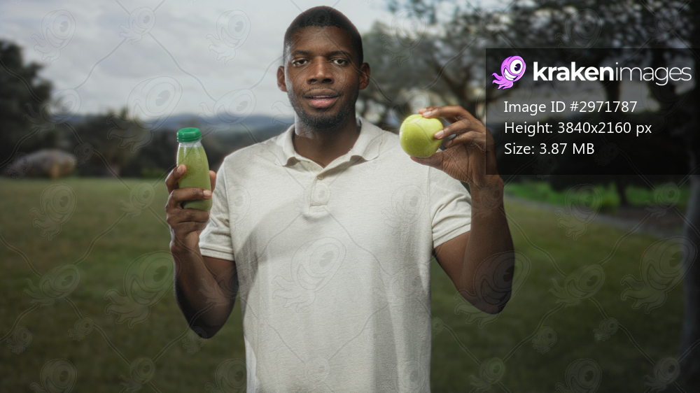 Young man holds green apple in right hand and green juice bottle in left, smiling with teeth and eyes squinted while standing on grassy park; joy healthy nutrition. - Kraken Images