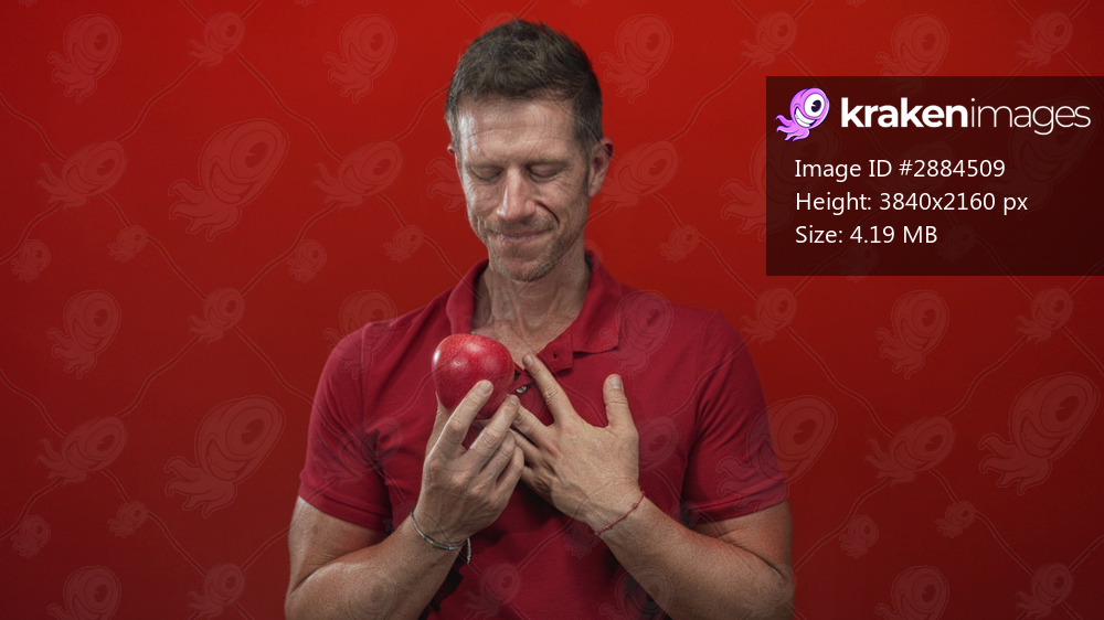 Young man holds red apple to chest in studio portrait with slight smile and visible hands; health contentment.