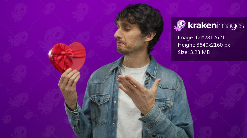 Young man holds red heart gift box with left hand and grimaces while raising right palm in purple studio; disgust.