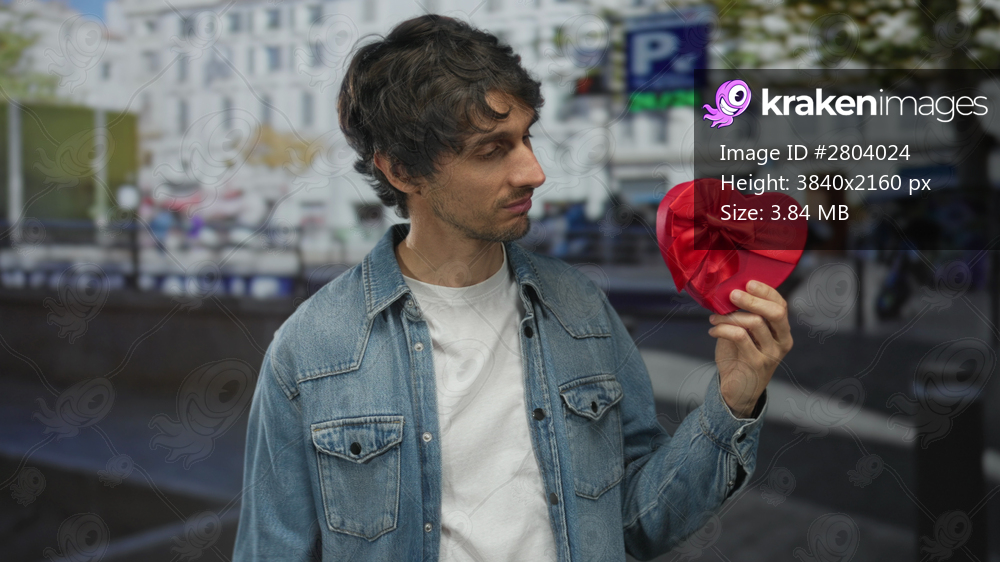 Young man holds red heart shaped gift box with finger pointing to gift on busy city street; romance.