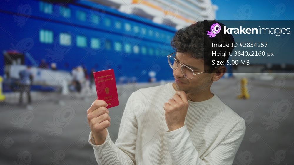 Young man holds red passport in hand and clutches chest on sunny street in front of blue ship; anxiety.
