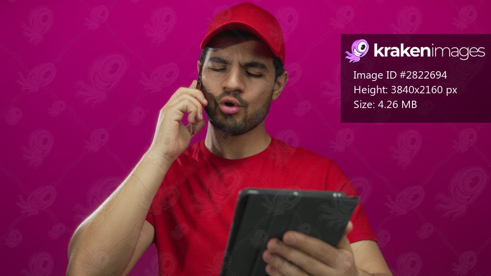 Young man holds smartphone and tablet against neon pink studio wall with focused expression; efficiency.