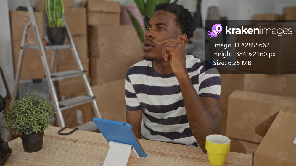Young man holds tablet with finger on chin amid scattered cardboard boxes and potted plant on table in a building; contemplation.