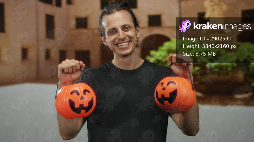 Young man holds two orange pumpkin buckets and smiles while standing in a building courtyard near a fountain and statue; playful joy.