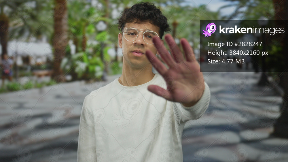 Young man holds up hand palm forward on street lined with trees and green foliage; assertive refusal.