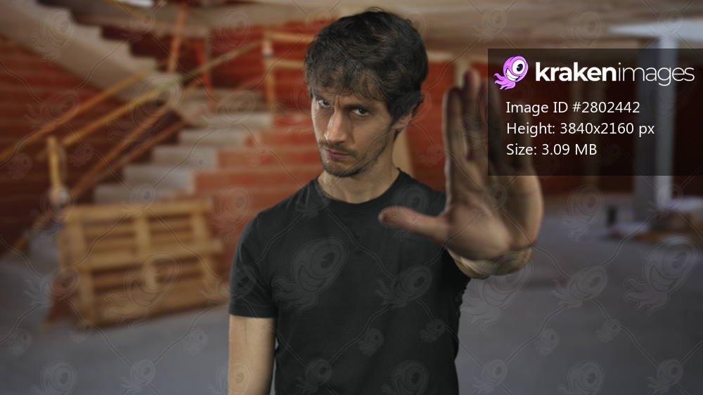 Young man holds up palm in stop gesture amid exposed brick and wooden pallet in unfinished building; warning defiance.
