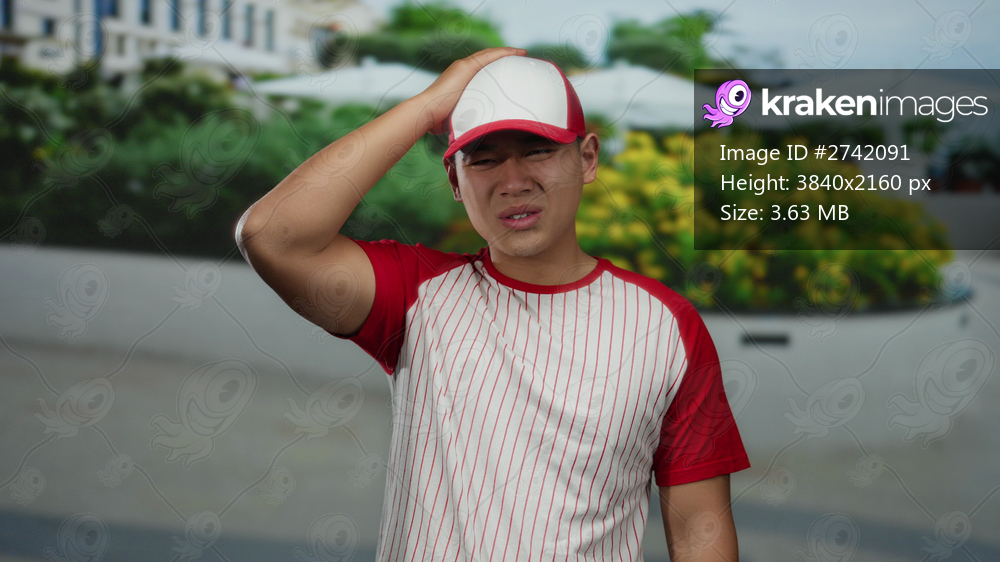 Young man in a baseball cap exhibits frustration on a city street during daylight with a garden backdrop, embodying urban outdoor youth culture.