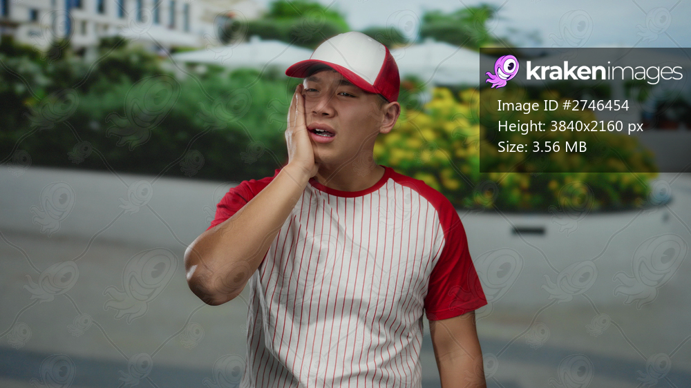 Young man in a baseball cap exhibits frustration on a city street during daylight with a garden backdrop, embodying urban outdoor youth culture.