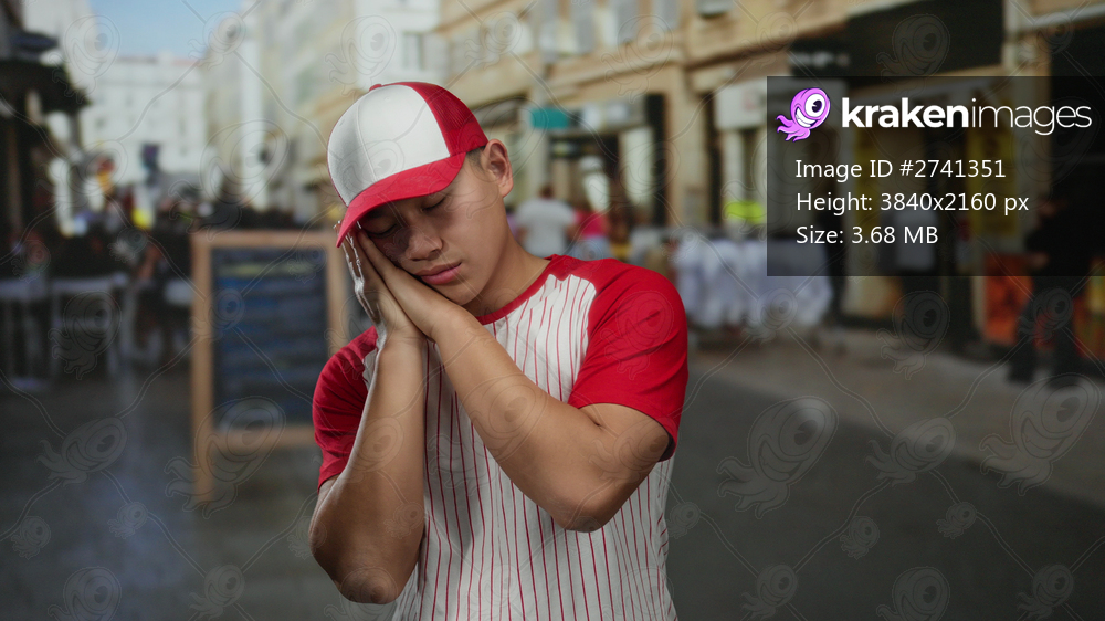 Young man in a baseball uniform standing outdoors near a cafe terrace appearing tired with closed eyes and hands under his cheek in a bustling urban street setting. - Kraken Images
