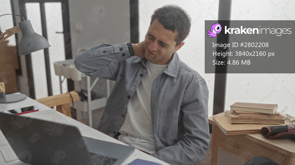 Young man in a casual shirt experiencing neck pain in a modern home office with a laptop and books on the desk, emphasizing indoor working environment. - Kraken Images
