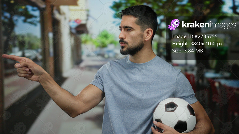 Young man in a city street holds a soccer ball, pointing and expressing focus, surrounded by urban elements and vibrant background.