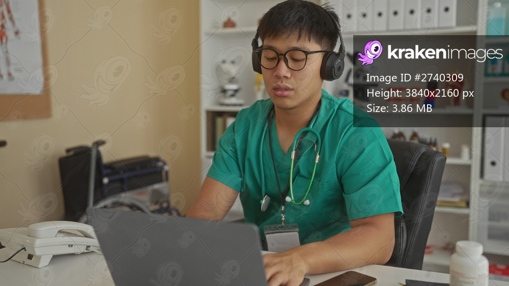 Young man in a clinic wearing scrubs and headphones using a laptop in a workplace setting with medical equipment around.