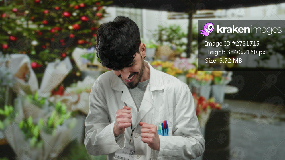 Young man in a flower shop wearing a white coat smiles while surrounded by vibrant flowers, capturing a joyful and lively market atmosphere.