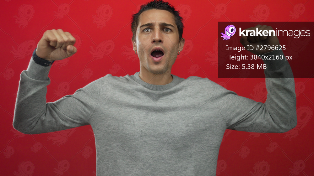 Young man in a gray sweater poses energetically against an isolated red background, expressing enthusiasm and vitality with his raised fists and dynamic stance. - Kraken Images