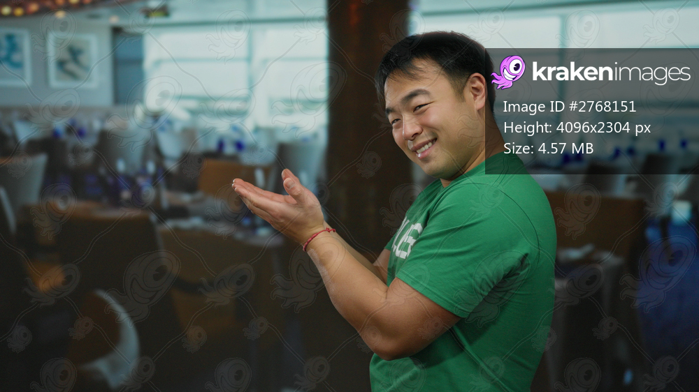 Young man in a green shirt smiling and gesturing inside a modern restaurant, showcasing an inviting and friendly atmosphere with blurred indoor decor.