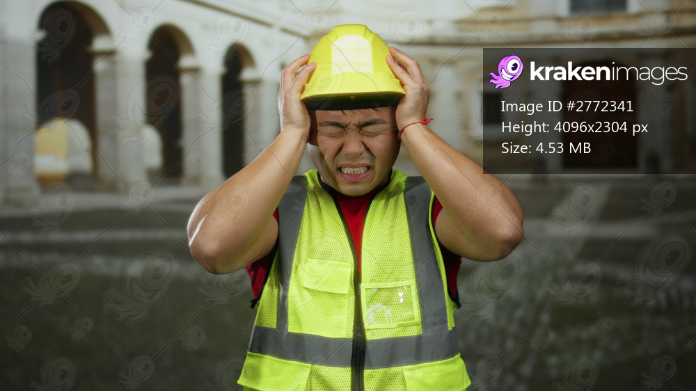 Young man in a hard hat and safety vest stands in an old university courtyard expressing stress and determination through gestures and posture.