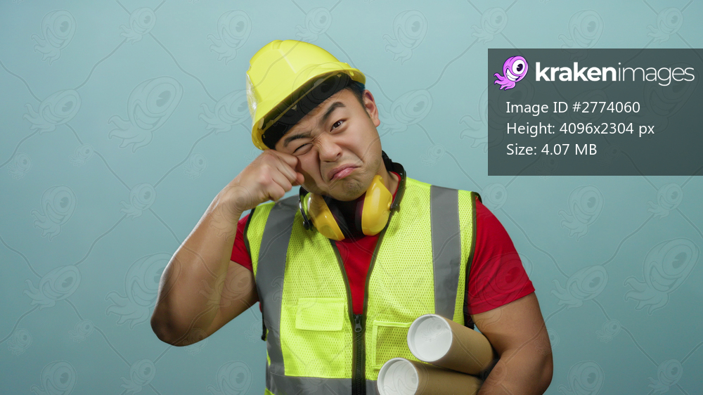 Young man in a hard hat and vest holding blueprints makes a mocking crying gesture against a white background conveying humor in construction context.
