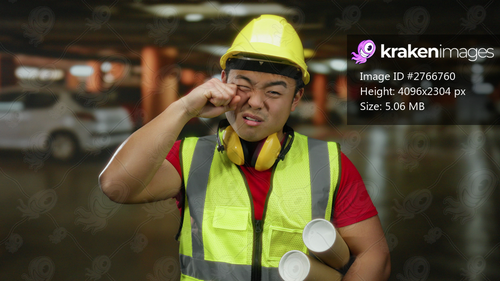 Young man in a high-visibility vest and hard hat jokingly mimics crying while holding blueprints in an indoor parking area.