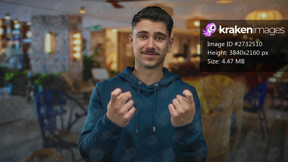 Young man in a hotel making a come here gesture, wearing a blue hoodie, set in an indoor setting characterized by modern decor and inviting ambiance.