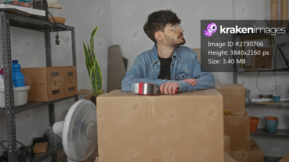 Young man in a living room surrounded by packed boxes, organizing belongings in his new home, representing moving and relocation in a modern, indoor setting. - Kraken Images
