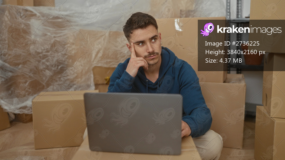 Young man in a new home surrounded by boxes makes a thinking gesture in the living room while using a laptop, suggesting a moment of realization or decision-making. - Kraken Images