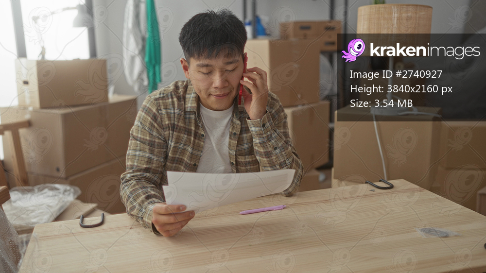 Young man in a new home talking on the phone, examining documents with moving boxes around in a bright living room setting.