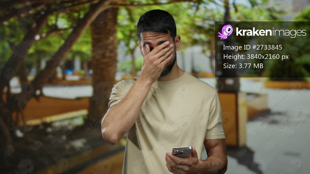 Young man in a park outdoors looking displeased at his phone, under lush green trees and sunlight.
