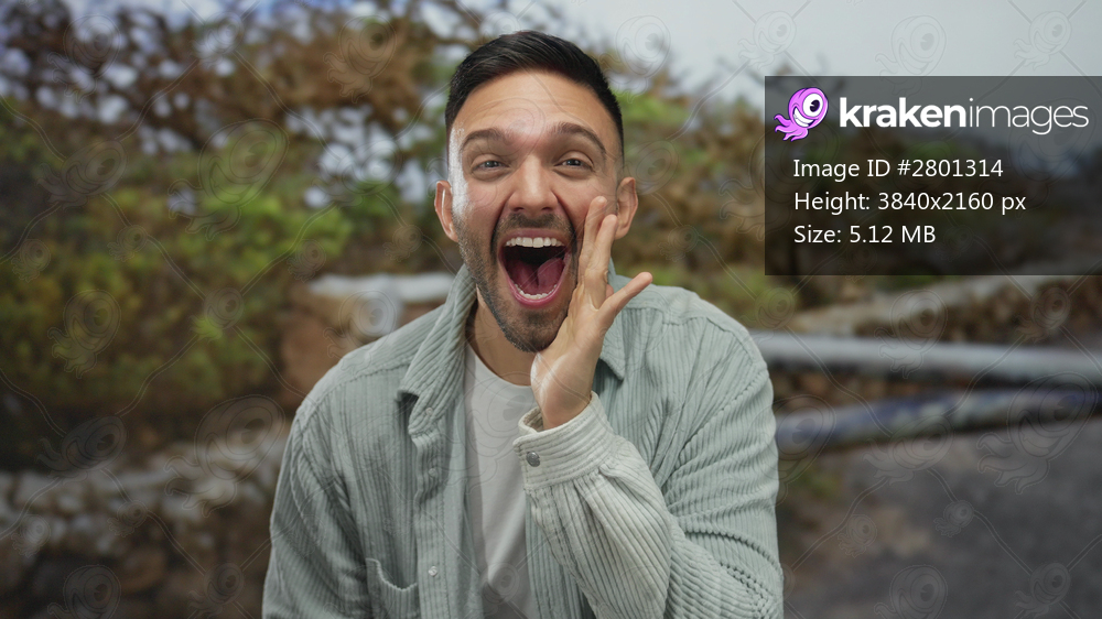 Young man in a park shouting energetically with a joyful expression surrounded by green trees outdoors in a lively setting.