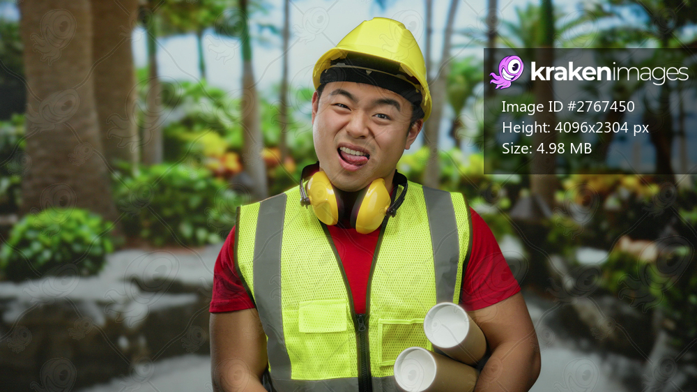 Young man in a park wearing a hardhat and vest, expressing humor while holding blueprints, surrounded by trees, embodying construction and planning in an outdoor setting. - Kraken Images