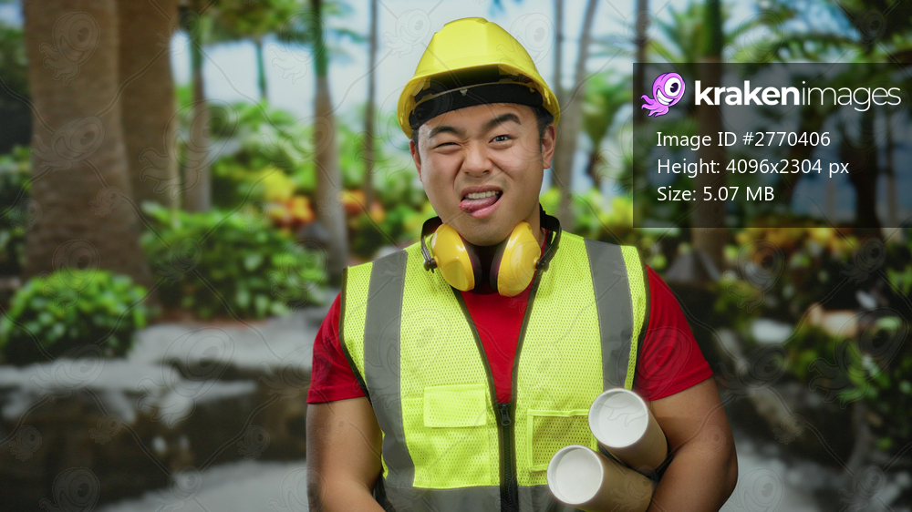 Young man in a park wearing a hardhat and vest, expressing humor while holding blueprints, surrounded by trees, embodying construction and planning in an outdoor setting. - Kraken Images