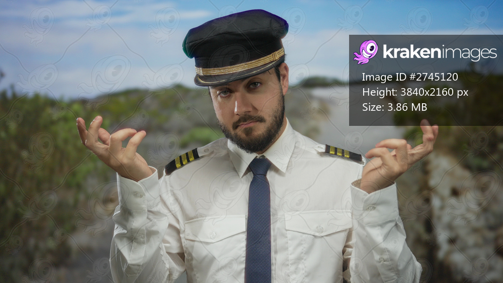 Young man in a pilot uniform with a beard gesturing in a park with greenery outdoors on a clear day, showcasing an expressive and thoughtful pose.
