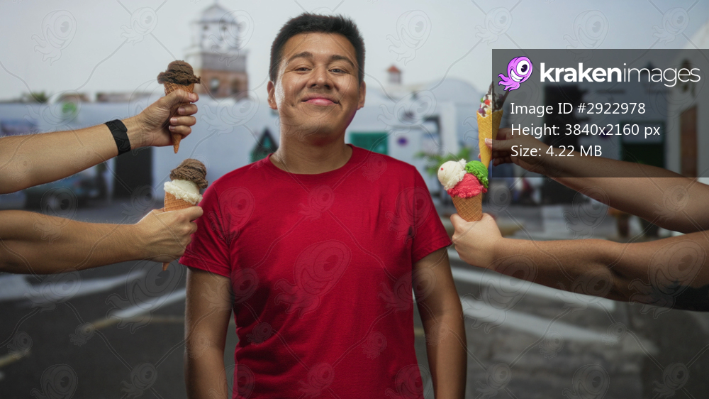 Young man in a red shirt eyes closed smiling as four hands offer ice cream cones on a street near white buildings; joy temptation.