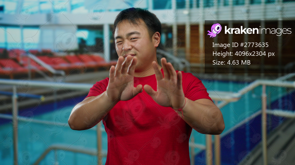 Young man in a red shirt gestures confidently on a cruise ship deck, embodying relaxation and leisure, with the pool and deck chairs in the background. - Kraken Images