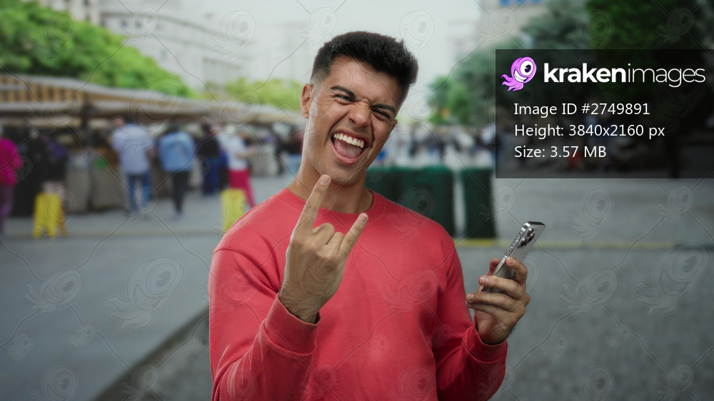 Young man in a red shirt joyfully makes a rock sign with his hand while holding a smartphone on a bustling city street filled with people and market stalls. - Kraken Images