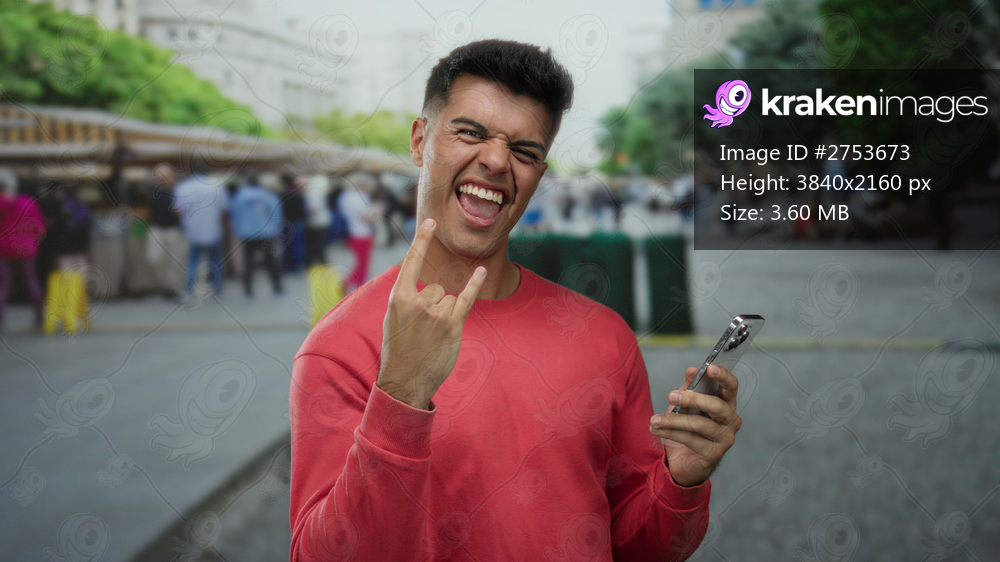 Young man in a red shirt joyfully makes a rock sign with his hand while holding a smartphone on a bustling city street filled with people and market stalls. - Kraken Images