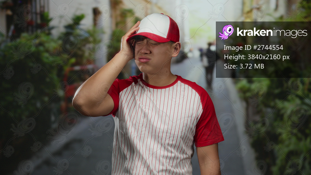 Young man in a red striped baseball uniform stands on a bustling city street capturing an urban outdoor atmosphere with a blurred background of greenery and pedestrians. - Kraken Images