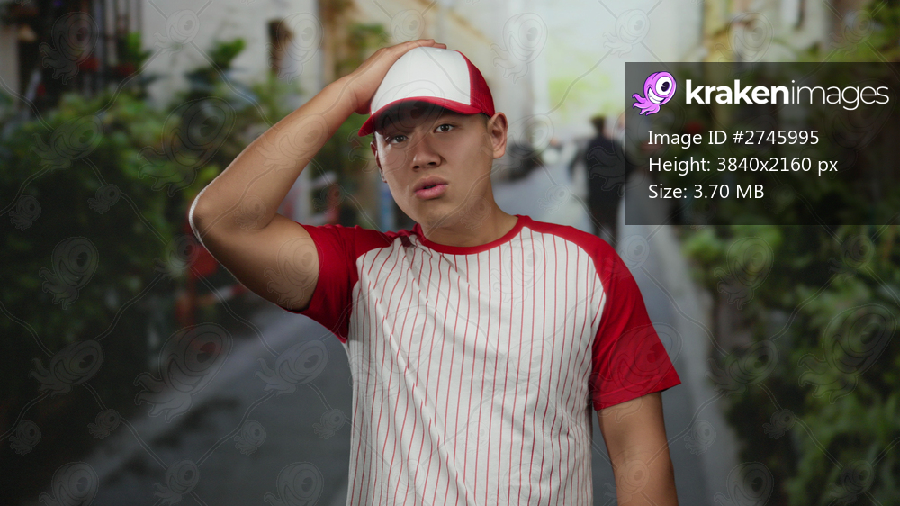 Young man in a red striped baseball uniform stands on a bustling city street capturing an urban outdoor atmosphere with a blurred background of greenery and pedestrians. - Kraken Images